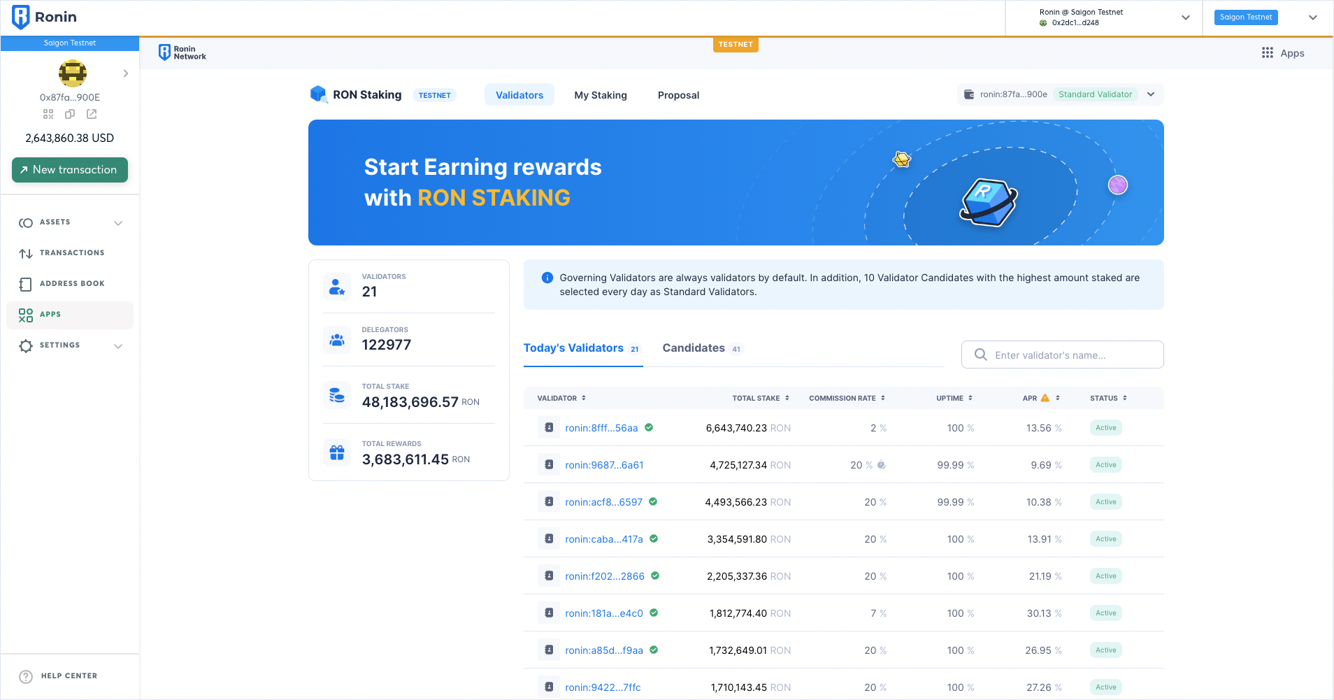 The Validator Dashboard is supported in Ronin Safe— you can find it under the Apps tab. After creating a safe, use your safe's address as an admin or governor address. Each action with this safe's address requires multiple confirmations depending on your safe's settings.