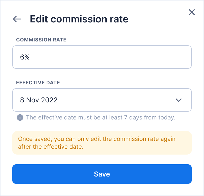 Enter the new commission rate in the range of 0-20%, and set the date it takes effect. This date must be at least seven days from today.